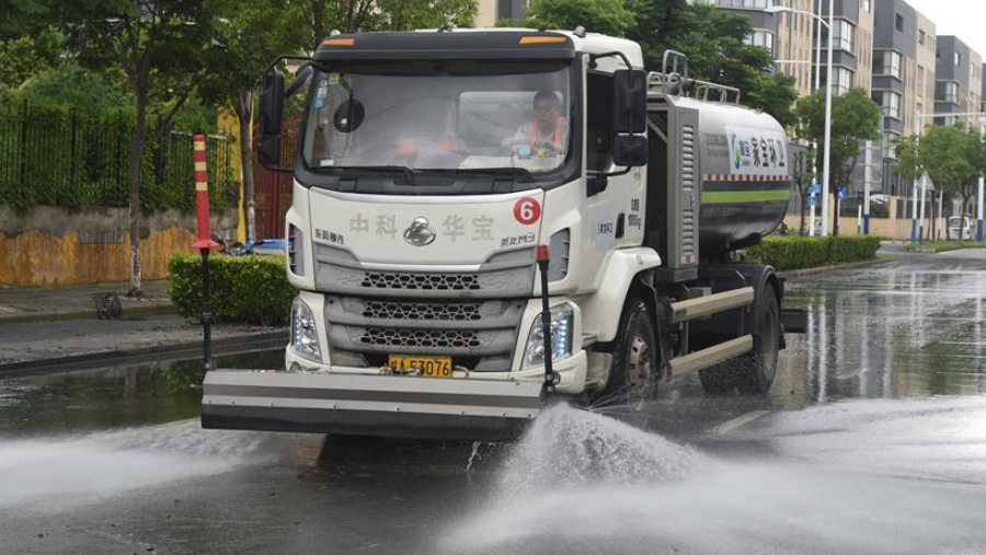 6月15日,在合肥市廬陽(yáng)經(jīng)濟(jì)開(kāi)發(fā)區(qū),工作人員駕駛灑水車清潔路面。