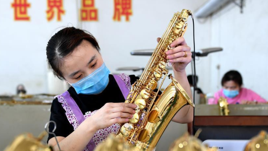 6月2日,工人在武強(qiáng)縣一家樂(lè)器廠生產(chǎn)車(chē)間內(nèi)組裝薩克斯。