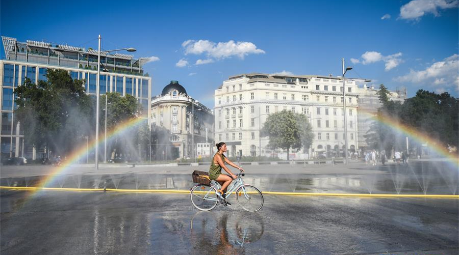 7月28日,在奧地利維也納,一名女子騎車經(jīng)過一處廣場的噴水設(shè)施。當(dāng)日,維也納市中心的最高氣溫達(dá)到37.2攝氏度,不少市民戲水消暑。