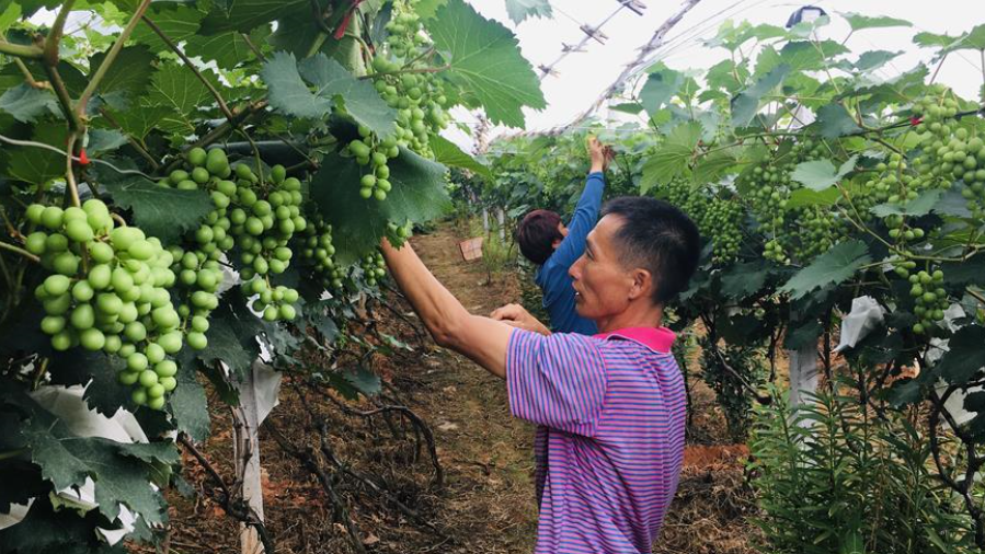 7月2日,湖南省宜章縣五嶺鎮(zhèn)沿江村村民肖國林夫婦在葡萄園內勞作。
