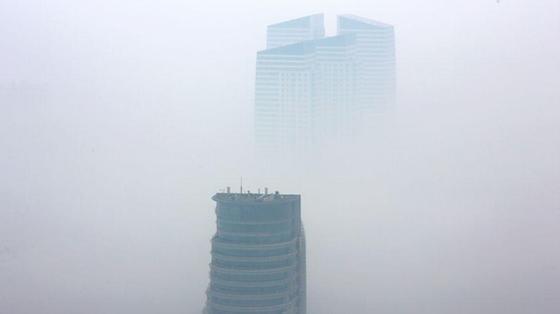 山東日照出現(xiàn)平流霧景觀,海邊的樓宇、建筑在霧中若隱若現(xiàn),宛若仙境。