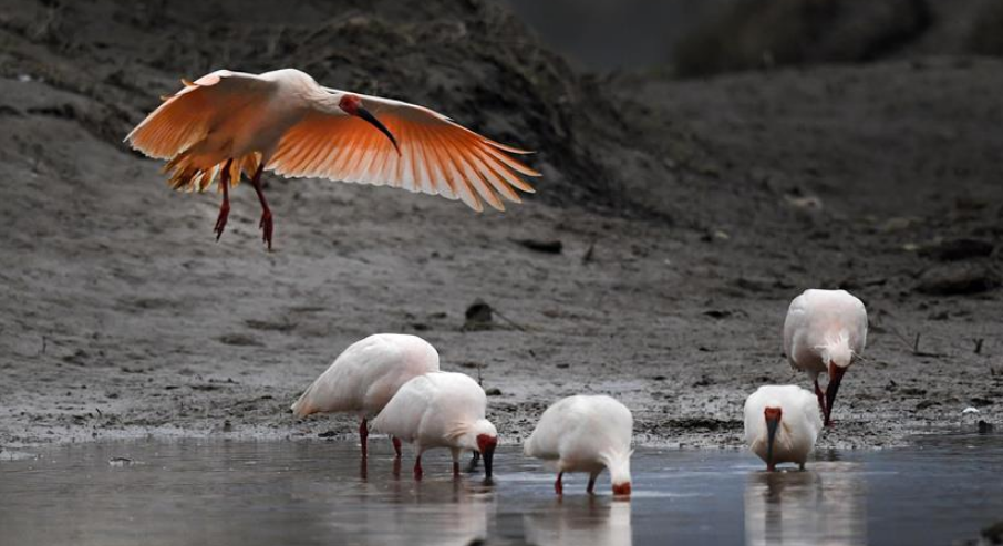 每年冬季,成群結隊的朱鹮飛翔在漢江及漢江支流的河灘、濕地,覓食、棲息,成為當?shù)匾坏懒聋惖娘L景線。?