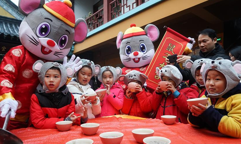 1月2日,小朋友在南京玄奘寺的贈粥送祝?;顒蝇F(xiàn)場喝臘八粥。 當日是農歷臘月初八,中國傳統(tǒng)臘八節(jié)。