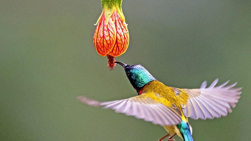 叉尾太陽鳥嬌艷靚麗,懸鈴花造型優(yōu)美,花與鳥相映成趣,成為冬季榕城一道美麗的風景。叉尾太陽鳥又叫“亞洲蜂鳥”,是福州的“明星鳥”。