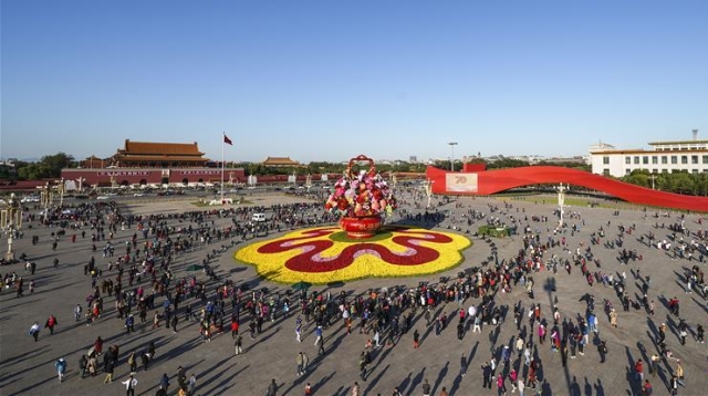 10月14日,以“花果籃”為主造型的天安門(mén)廣場(chǎng)中心花壇吸引了眾多游客參觀拍照?!盎ü@”的夜景更是流光溢彩,絢爛迷人。