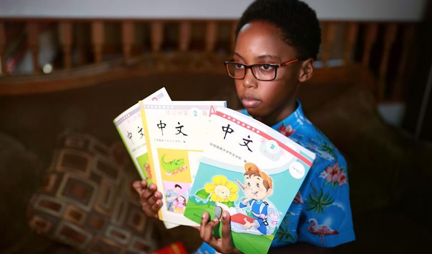 9月25日,在美國(guó)芝加哥,卡亞·恩朱比展示漢語(yǔ)課本。新華社記者 汪平 攝 9月25日,在美國(guó)芝加哥,卡亞·恩朱比接受新華社記者采訪。
