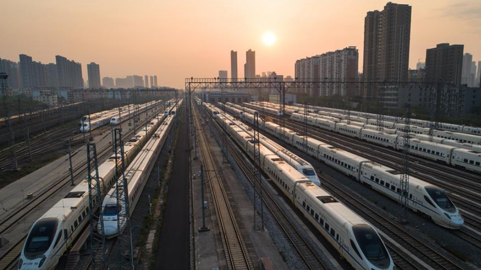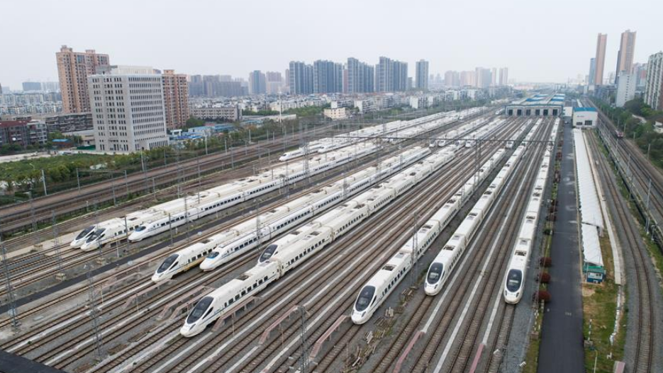 當日,武漢市正式解除離漢離鄂通道管控措施,幾十組在武漢動車段經(jīng)過檢修消殺的動車組,猶如“陸地艦隊”??吭诖孳嚲€上,蓄勢待發(fā),重新啟程。