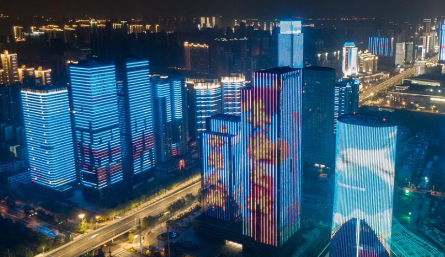 4月8日零時起,武漢市正式解除離漢離鄂通道管控措施,全市景觀照明開啟(無人機拍攝)。