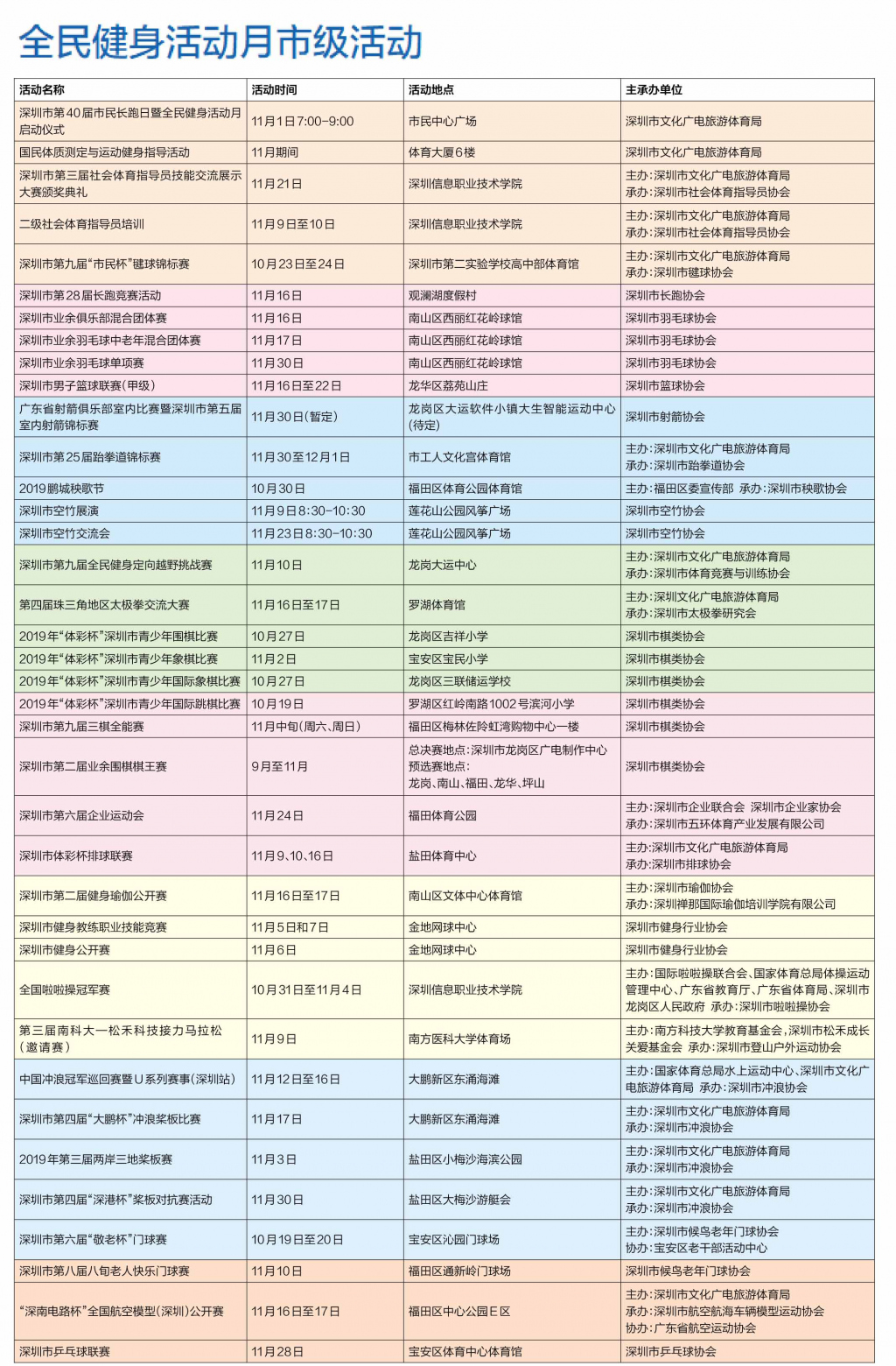 11月期間,深圳將舉辦37場市級活動,內容包括跑步、籃球、羽毛球、射箭、跆拳道、秧歌、定向越野賽、太極拳、排球、棋類等比賽以及國民體測與健身指導等系列活動。同時,全市各區(qū)、各單位也因地制宜地將舉辦百余場方便市民參與的全民健身活動,涵蓋項目豐富多彩,最大限度地滿足市民群眾的健身需求。