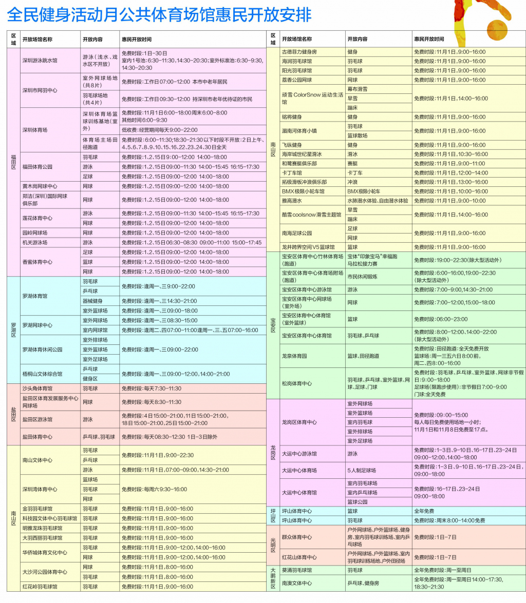 全市各區(qū)的公共體育場館、體育設施和學校體育場地也將免費或優(yōu)惠向市民開放,以滿足廣大群眾的健身需求,豐富群眾體育文化生活,吸引更多人群參加健身活動。值得注意的是,在今年免費開放的體育場館中,不但有市區(qū)級建設的大型體育中心、體育館,更有如機關游泳館、華僑城體育中心、古德菲力健身房等幾十余家社會體育場館,政府主導,社會力量融入,全民健身范圍得以大幅擴大。