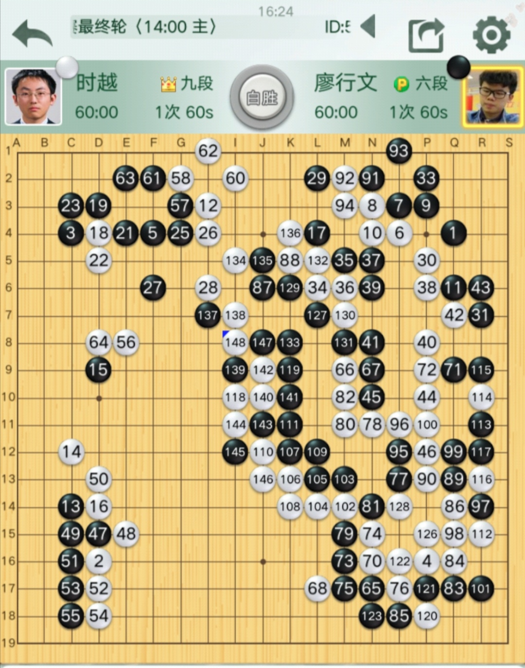 時越自評:序盤階段正常,黑棋率先在上邊打入挑起戰(zhàn)斗,中盤黑棋判斷失誤,之后形成轉(zhuǎn)換,白棋確立勝勢。