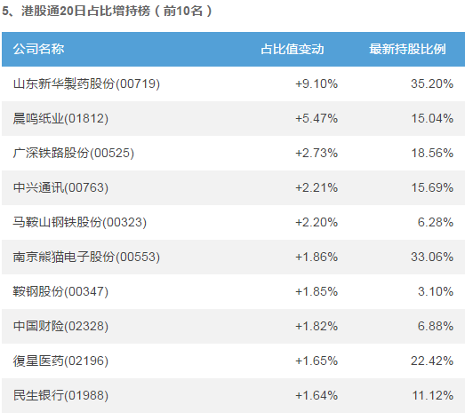 在最近5個(gè)交易日內(nèi),晨鳴紙業(yè)(01812)、長(zhǎng)城汽車(02333)、山東新華製藥股份(00719)港股通持股占比增加值最大,分別增加5.17%、0.82%、0.62%;金蝶國(guó)際(00268)、金山軟件(03888)、阜豐集團(tuán)(00546)港股通持股占比減少值最大,分別減少-1.26%、-1.25%、-0.86%。