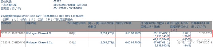 根據(jù)聯(lián)交所資料顯示,摩根大通于10月31日減持舜宇光學(xué)科技(02382)333萬(wàn)股,每股作價(jià)約68.27港元,總值2.27億港元,最新持股量減至5.76%。