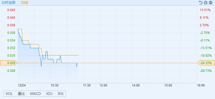 香港生命科學(xué)(08085)面臨出牌,股價(jià)重挫,截至11時(shí)18分,跌24.32%,報(bào)價(jià)0.028港元,成交額78.43萬。