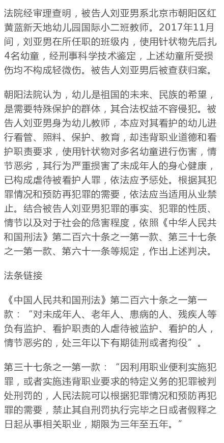 12月26日上午,北京市朝陽(yáng)區(qū)人民法院依法對(duì)被告人劉亞男(紅黃藍(lán)幼兒園教師)虐待被看護(hù)人案公開(kāi)宣判,以虐待被看護(hù)人罪一審判處劉亞男有期徒刑一年六個(gè)月。