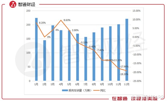 再具體一點(diǎn),根據(jù)智通財(cái)經(jīng)APP的統(tǒng)計(jì),2018年乘用車全年累計(jì)銷量2235萬(wàn)輛,同比下降5.8%,其中在12月份,銷量同比下滑達(dá)19.2%,連續(xù)8個(gè)月增長(zhǎng)持續(xù)下滑,且連續(xù)6個(gè)月出現(xiàn)負(fù)增長(zhǎng)。這說(shuō)明汽車的“消化”能力已經(jīng)到了一個(gè)瓶頸。