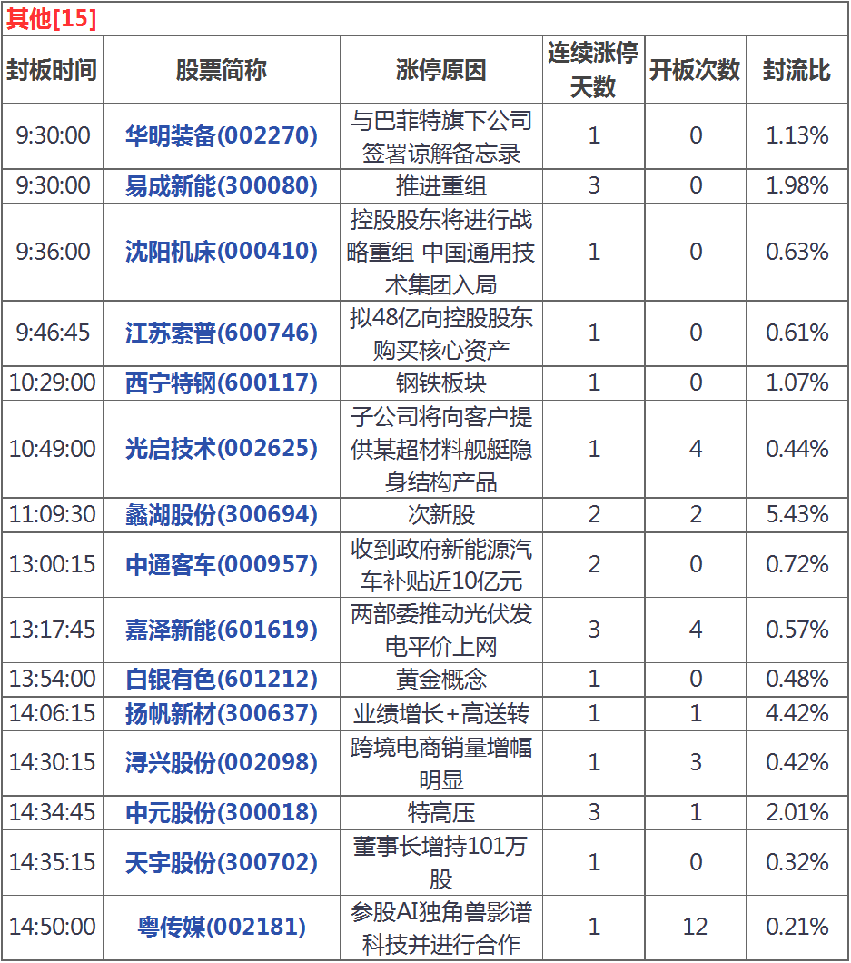 今天漲停家數(shù)較上一交易日有所減少,兩市45家漲停;跌停15家。盤面上,鋼鐵、氫燃料電池、煤炭導(dǎo)等板塊漲幅居前,次新股、半導(dǎo)體、國防軍工等板塊跌幅居前。