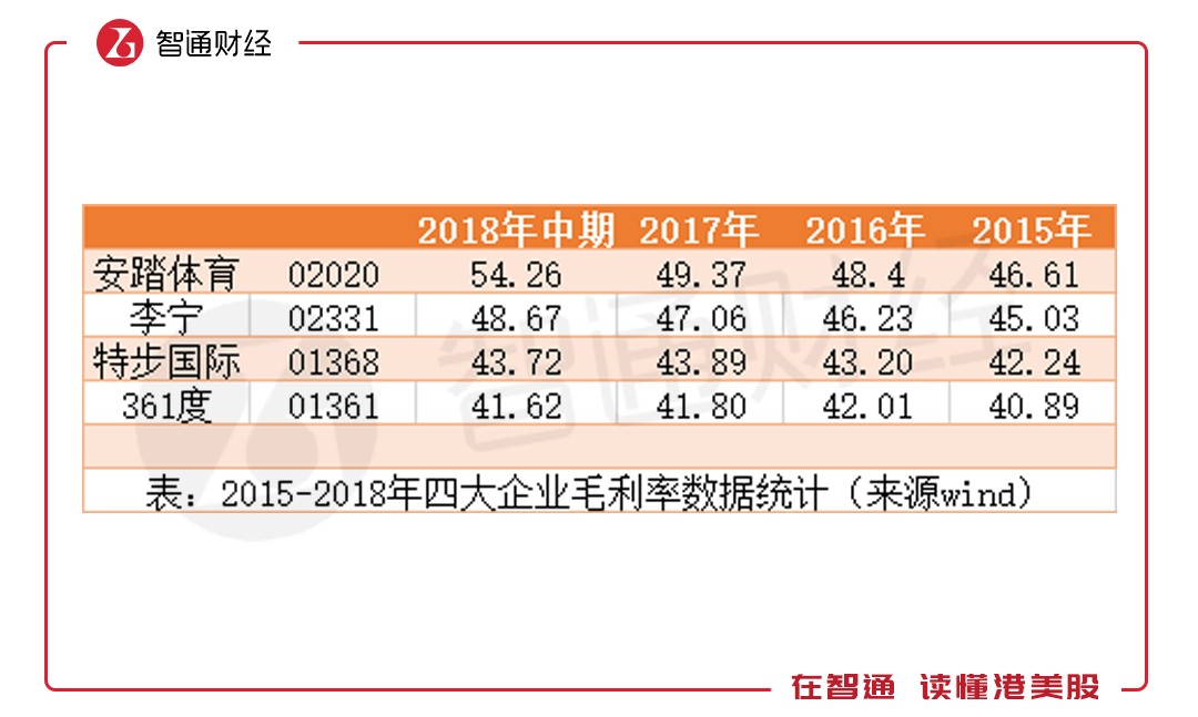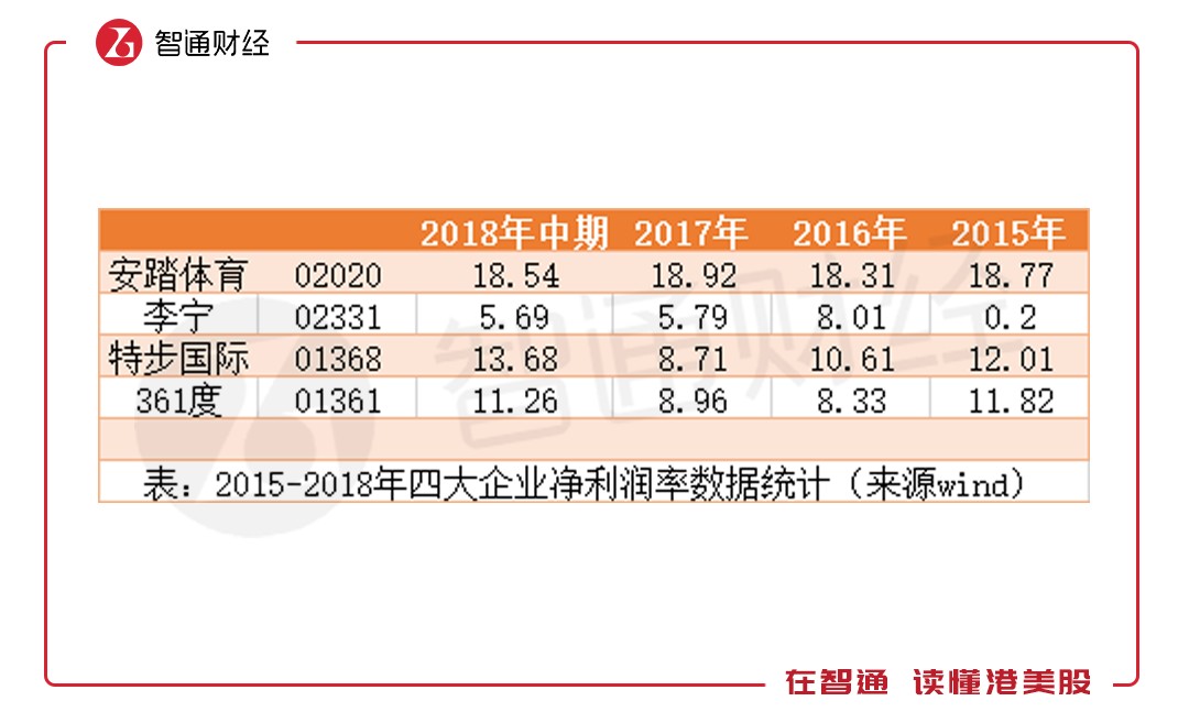 然而,高毛利優(yōu)勢(shì)并未在利潤中體現(xiàn)。2015年時(shí),李寧的凈利潤率為0.2%,2016年時(shí)上升至8.01%,2018年上半年時(shí),安踏、特步、361的凈利潤率分別為18.54%、13.68%、11.26%,均遠(yuǎn)高于李寧的5.69%。