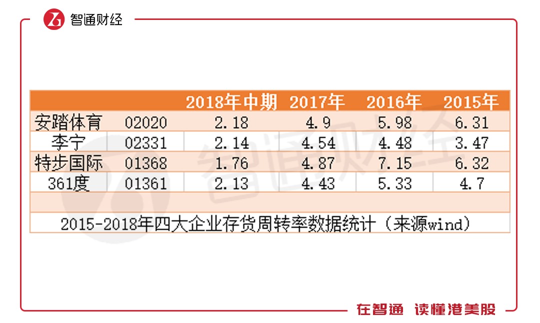2015年時(shí),李寧雖扭虧為盈,但在存貨周轉(zhuǎn)率上,與競(jìng)爭對(duì)手仍相差較遠(yuǎn)。李寧當(dāng)時(shí)的存貨周轉(zhuǎn)率僅3.47次,而安踏體育(02020)為6.31次,特步國際(01368)為6.32次,連361度(01361)也有4.7次。