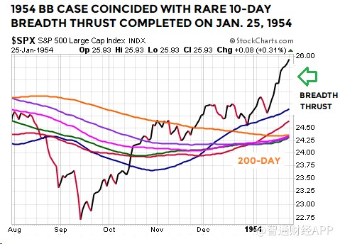 1954年1月25日時(shí)的廣量沖力指標(biāo)如下圖所示,在4個(gè)交易日前,布林通道月線圖出現(xiàn)前述形態(tài)。與2019年相似的是,當(dāng)時(shí)的點(diǎn)位接近200日均線的水平: