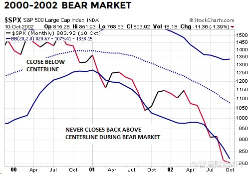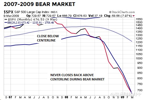 在2007年10月股市見頂之后,標(biāo)普500指數(shù)在2008年1月收于布林通道月線中軌以下,在熊市期間都無法重新回到布林通道中軌以上。2008年6月標(biāo)普500指數(shù)收于下軌以下: