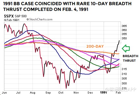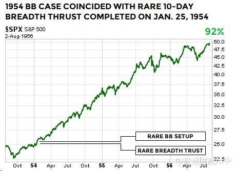 上述布林通道技術(shù)形態(tài)屬較為罕見的類型。值得注意的是,1954年和1991年時(shí)的另一技術(shù)指標(biāo),廣量沖力指標(biāo),基本上與2019年1月21日出現(xiàn)的廣量沖力指標(biāo)形態(tài)類似。因此,在1954年、1991年和2019年,標(biāo)普500指數(shù)走出了布林通道及廣量沖力指標(biāo)都相似的技術(shù)形態(tài)。