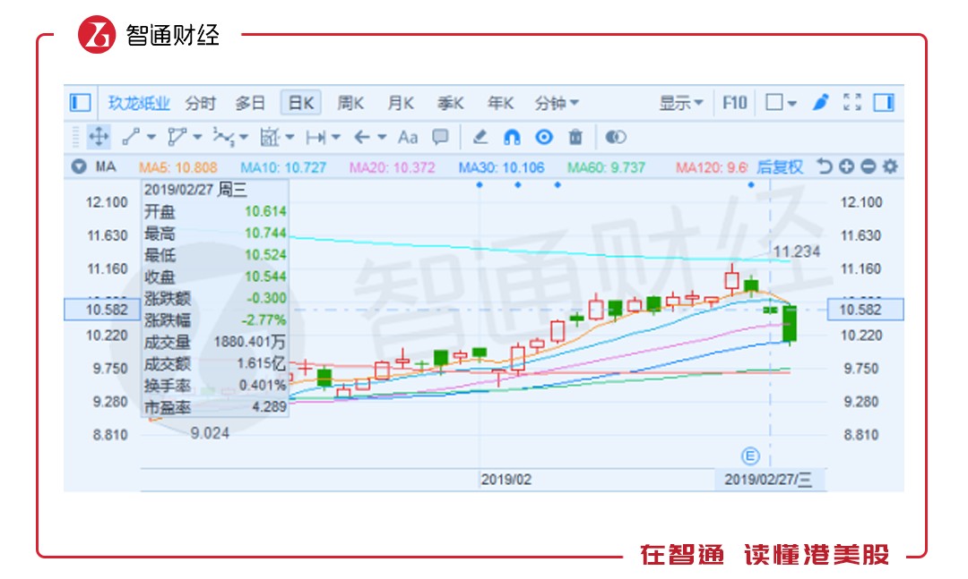 自周一港A股暴漲之后,玖龍紙業(yè)(02689)股價便已經(jīng)歷連續(xù)三天下跌。2月27日,公司召開業(yè)績會當(dāng)天,公司股價收報10.54,跌2.77%;28日續(xù)跌4.68%至8.14港元。