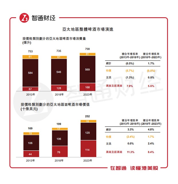 同時,亞太啤酒市場還表現(xiàn)出明顯的高端化趨勢。根據(jù)GlobalData的數(shù)據(jù),2018年至2023年,亞太地區(qū)高端及超高端啤酒的銷量會以5.6%的年均復合增長率增長至168億升,市場價值則以8.4%的年均復合增長率增長至1140億元。