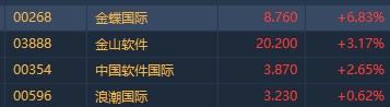 軟件板塊盤中強(qiáng)勢(shì)走高,截至發(fā)稿,金蝶國際(00268)漲6.83%,金山軟件(03888)漲3.17%,中國軟件國際(00354)漲2.65%。