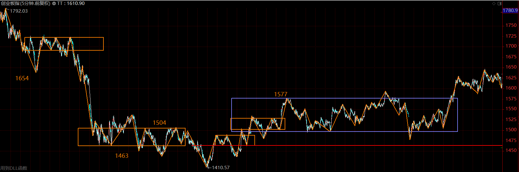 創(chuàng)業(yè)板指數(shù)依舊強(qiáng)勢(shì),這里在構(gòu)建30分鐘級(jí)別的三買(mǎi),以1577點(diǎn)為界,如果回調(diào)不破,則這里將是創(chuàng)業(yè)板主升行情的起點(diǎn)。如若重新跌回中樞內(nèi)部,則按中樞震蕩處理。創(chuàng)業(yè)板走勢(shì)要強(qiáng)于主板很多,后續(xù)行情多半仍然圍繞創(chuàng)業(yè)板展開(kāi)。