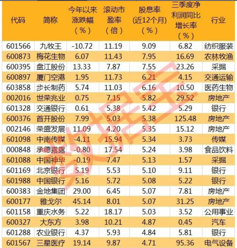 3、高股息率股票貴在穩(wěn)健、安全,長期看,即使市場出現(xiàn)長期調(diào)整,高股息個股也可以給投資者帶來穩(wěn)定的現(xiàn)金收入;目前高股息率個股的整體估值較低,根據(jù)以下條件篩選高股息率潛力股:1、滾動市盈率小于20倍;2、2016、2017、2018連續(xù)三年股息率大于4%;3、最近12個月股息率大于4%;4、前三季度凈利潤同比增長。