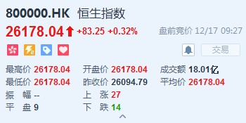 恒生指數(shù)開(kāi)盤(pán)漲0.18%,報(bào)25860.68點(diǎn)。國(guó)企指數(shù)漲0.04%,報(bào)10234.45點(diǎn)。紅籌指數(shù)漲0.2%,報(bào)4217.54點(diǎn)。大市盤(pán)前成交18.07億港元。隔夜美股微升,港股ADR偏軟。