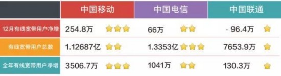 (各個(gè)項(xiàng)目中,第一為三顆星,第二為兩顆星,第三為一顆星。以上數(shù)據(jù)測算依據(jù)三大運(yùn)營商公布的營運(yùn)數(shù)據(jù)。)