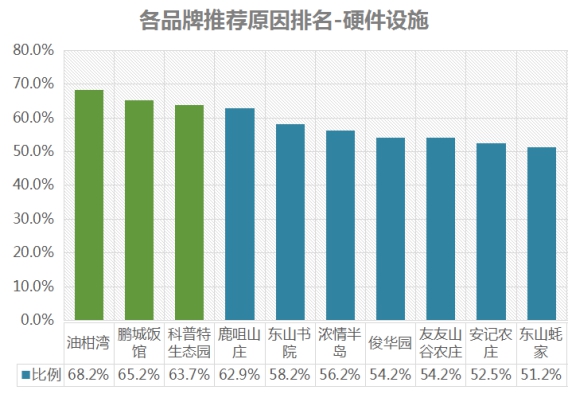 排名第一的是油柑灣,硬件設(shè)施推薦率為68.2%;其次是鵬城飯館,推薦率為65.2%;第三名是科普特生態(tài)園,推薦率為63.7% 。