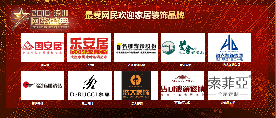 盛典現(xiàn)場(chǎng)“2018年度十大行業(yè)最受網(wǎng)民歡迎品牌”獲獎(jiǎng)名錄正式對(duì)外公布。國(guó)安居;樂(lè)安居;名雕裝飾股份;蘭舍硅藻泥;海大裝飾;東鵬瓷磚;慕思寢具;浩天裝飾;馬可波羅瓷磚;索菲亞衣柜10個(gè)品牌獲得“2018年度家居裝飾行業(yè)最受網(wǎng)民歡迎品牌”榮譽(yù)稱號(hào)。