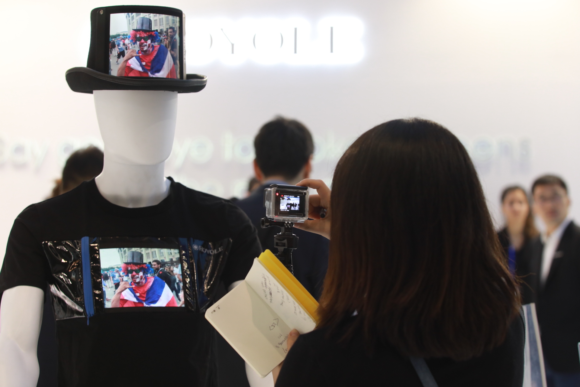 法國(guó)一女士體驗(yàn)高清柔性屏?xí)r尚衣帽后對(duì)柔宇工作人員說(shuō):"柔性屏?xí)r尚衣帽套裝超酷,這個(gè)如果能穿去派對(duì)的話就太完美了。"