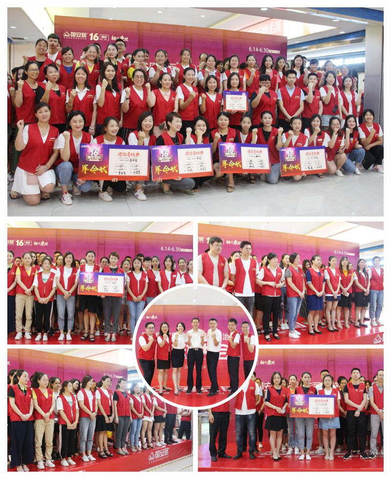此次誓師大會(huì)作為“司慶大促”的啟動(dòng)引擎,極大地點(diǎn)燃了參與者的熱情與激情。莊嚴(yán)的誓師大會(huì)上,來自深惠各大門店的全體方陣隊(duì)員高舉隊(duì)旗,高喊口號(hào),將現(xiàn)場(chǎng)氣氛推向高潮,品牌代表們紛紛上臺(tái)發(fā)言,幾百家建材家具品牌集結(jié)成了猛虎、獵豹、雄獅、雪豹、等等團(tuán)隊(duì)方陣,登場(chǎng)亮相,高呼團(tuán)隊(duì)口號(hào),并且當(dāng)場(chǎng)簽署了司慶大惠的軍令狀,并從各商場(chǎng)總經(jīng)理的手中接過了團(tuán)隊(duì)軍旗,這將預(yù)示著“國(guó)安居16周年司慶”定將以卓越的佳績(jī),再創(chuàng)銷售的新高!