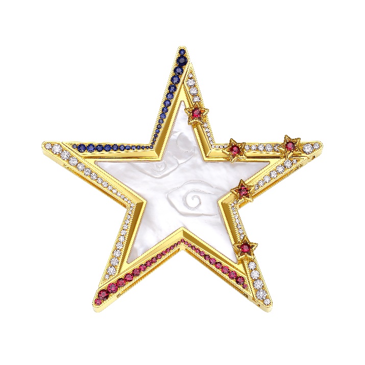 作為本次發(fā)布會(huì)主角,周大福17916系列新品“宸”曾作為第11屆“法國(guó)圣埃蒂安國(guó)際設(shè)計(jì)雙年展”參展作品,在世界舞臺(tái)上綻放過(guò)光芒?!拔褰切恰钡脑煨腿谌肓朔▏?guó)國(guó)旗藍(lán)、白、紅三色和中國(guó)國(guó)旗的五角星元素,代表了中法兩國(guó)的交流與合作,雙方希望通過(guò)宸這樣意義深遠(yuǎn)的產(chǎn)品,見證和促進(jìn)兩國(guó)的和平發(fā)展與經(jīng)濟(jì)交流。“宸”以北極星為靈感來(lái)源,寓意點(diǎn)亮年輕人的生活與夢(mèng)想。別具一格的五角星設(shè)計(jì)藝術(shù)感十足,鉆石與22K金的加持,更讓整個(gè)作品展現(xiàn)出奪目光彩。白貝母項(xiàng)鏈外圈圍以鉆石、寶石,一款三戴,幻化無(wú)限魅力。簡(jiǎn)潔的五角星造型,干凈有力,猶如夜空中指引前行的明星。