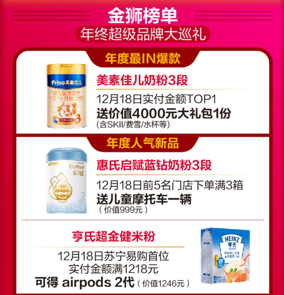 蘇寧紅孩子金獅榜單上,年度最IN爆款、人氣新品、超級品牌大巡禮,全是親子家庭想要的。寶媽寶爸購美素佳兒奶粉3段且實付金額TOP1的用戶將免費獲得價值4000元大禮包一份;單會員ID購買惠氏藍鉆系列奶粉實付金額最高且滿3999元,就送祖馬瓏圣誕限量香氛禮盒一套;購買飛鶴奶粉首位且實付金額滿8888元的消費者將獲得華為NOVA5G一個。此外,亨氏、樂可愛、費雪、小豬班納、好奇等母嬰品牌都有超值驚喜和好禮相送。