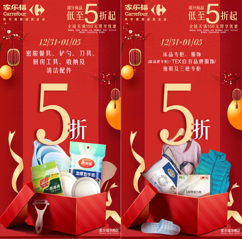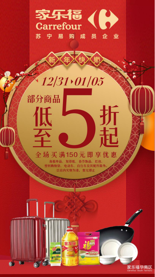 12月31日至1月5日,顧客于家樂(lè)福華南區(qū)門店全場(chǎng)買滿150元,即享指定產(chǎn)品5折起優(yōu)惠,省錢攻略一次解鎖。