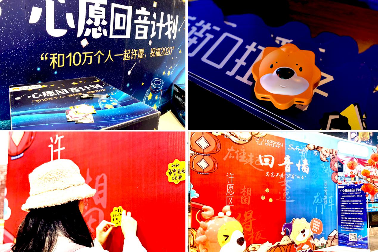 “心愿回音計(jì)劃”率先在南京徐莊園區(qū)啟動(dòng),蘇寧小店搭建起巨大的許愿瓶,瓶身通體為湛藍(lán)色,在藍(lán)色的背景中猶如海上漂流,并且內(nèi)置數(shù)不清的心愿球,許愿者可以在心愿球上寫出個(gè)人心愿,投回許愿瓶后等待圓夢(mèng),將會(huì)“和10萬(wàn)個(gè)人一起許愿,祝福2020”。