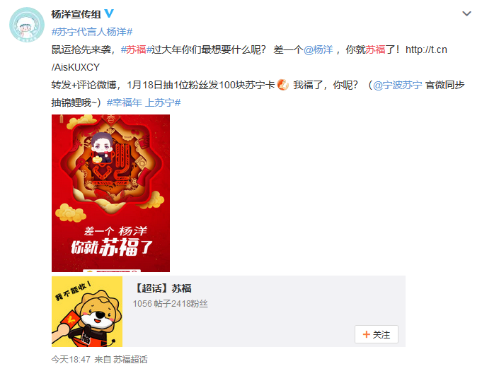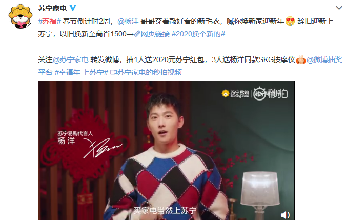 蘇寧代言人楊洋和江疏影也給大家?guī)砹瞬簧俑@?,粉絲們繼續(xù)喊話愛豆,“過年就差一個楊洋了,萬一實現(xiàn)了呢”。蘇寧家電直接開啟鼠運來襲模式,粉絲參與微博互動,就有機會獲得2020元蘇寧紅包,還能獲得楊洋同款SKG按摩儀。
