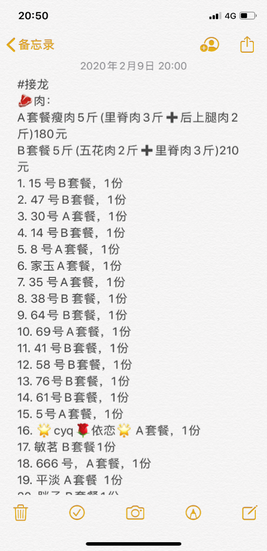 “為了讓買肉的過程更加有效,我們聯系供應商,將肉分為套餐,比如3斤里脊肉和2斤五花肉是A套餐,3斤里脊肉和2斤后腿肉就是B套餐”,胡玉玲說到。套餐一分,供應商也好根據套餐將肉分成份,方便居民購買。每次拿到貨的胡玉玲,都會選幾袋肉出來,用秤核實一下,以免社區(qū)的居民買到少了秤頭的肉,產生不必要的麻煩。她也會在大家拿到肉之后做調研,在群里詢問大家對每天買到的肉是否滿意,“從開始送肉到現在十多天了,還沒有收到過差評”,胡玉玲開心地說。