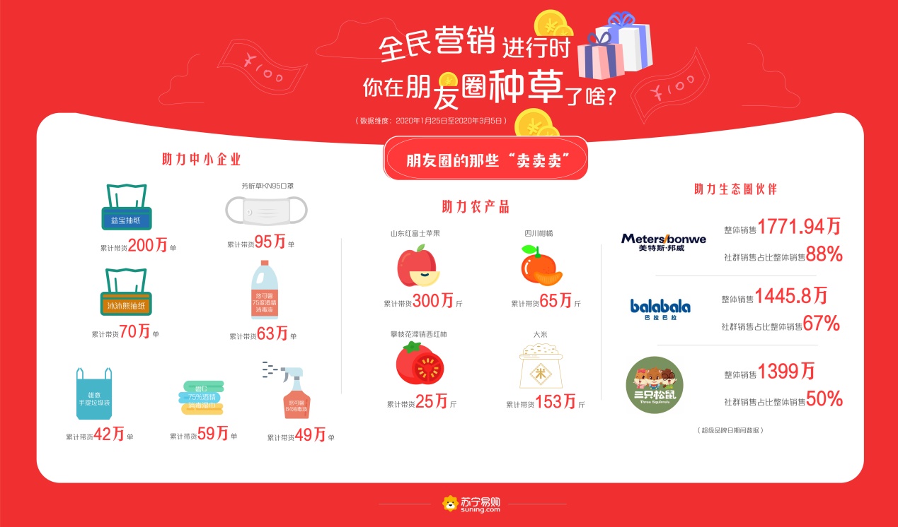 深圳新聞網(wǎng)2020年3月10日訊 線上買菜、線上看病、直播上課、遠(yuǎn)程健身……“宅經(jīng)濟(jì)”爆發(fā),使得社群私域流量積累的能量進(jìn)一步凸顯,全民營(yíng)銷成為新風(fēng)口。近日,蘇寧易購發(fā)布全民營(yíng)銷大數(shù)據(jù),2020年1月25日至3月5日,蘇寧推客買家數(shù)和賣家數(shù)分別突破千萬、百萬大關(guān),80后成為朋友圈買、賣“雙主力”,糧油休食、個(gè)護(hù)家清、生鮮等產(chǎn)品成為最受歡迎的消費(fèi)品類。