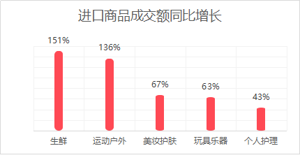 隨著人們生活水平的提升,進(jìn)口生鮮成交額同比增長了151%。近幾年,進(jìn)口生鮮的價格門檻下降,尤其是進(jìn)口的奶制品、豬肉、牛肉的價格跟國產(chǎn)商品十分接近。此外,借助于品牌優(yōu)勢,進(jìn)口的運動戶外、美妝護(hù)膚、玩具樂器、個人護(hù)理等商品的成交額同比增長也比較高。