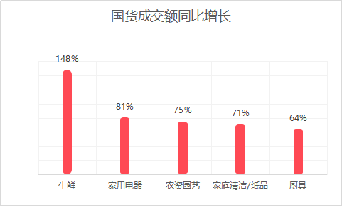 “五一”小長假期間,國產(chǎn)商品的成交額同比增長了52%。國產(chǎn)的生鮮產(chǎn)品十分豐富,農(nóng)產(chǎn)品觸網(wǎng)利用信息經(jīng)濟(jì)快速的將地方市場轉(zhuǎn)化為全國市場,成交額同比增長了148%。此外,國產(chǎn)的家電、農(nóng)資園藝、清潔用品及廚具的成交額同比增長較高。