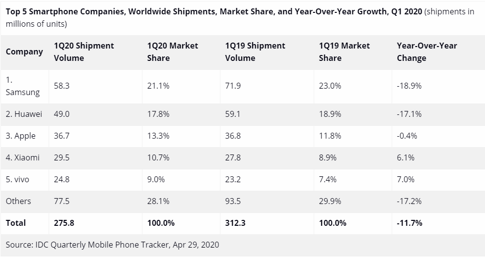 見(jiàn)圳客戶端·深圳新聞網(wǎng)2020年5月6日訊 國(guó)際權(quán)威機(jī)構(gòu)IDC最新報(bào)告顯示,全球智能手機(jī)出貨量在2020年第一季度同比下降11.7%。其中,三星、華為、蘋果依舊穩(wěn)居前三,分別為21.1%、17.8%和13.3%。