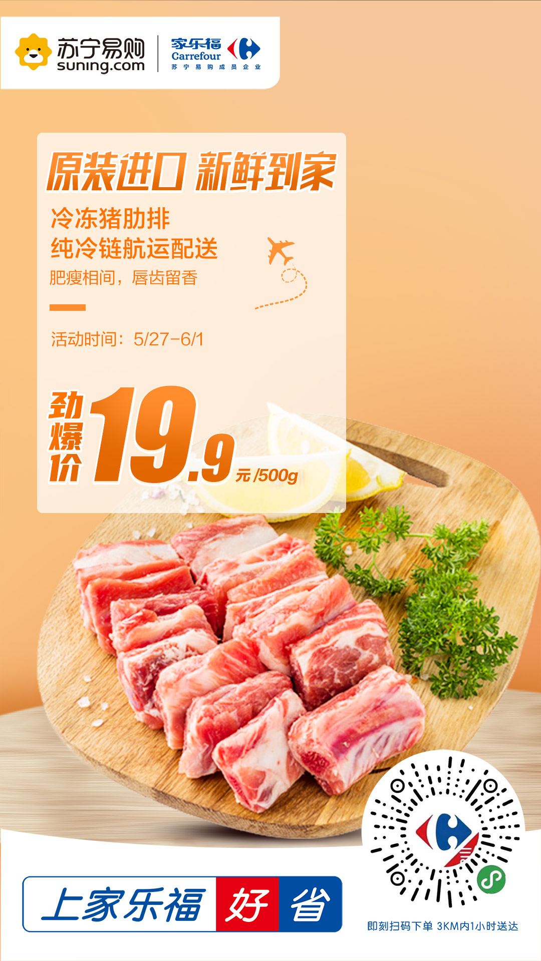 進(jìn)口冷凍豬肋排是本次活動的主推爆品之一。生豬按照歐盟標(biāo)準(zhǔn)養(yǎng)殖,采用非轉(zhuǎn)基因飼料喂養(yǎng),全程不使用抗生素,原廠精切,采用純冷鏈航運配送,全程可溯源。肥瘦相間,讓人唇齒留香。豬肉價格高企的背景下,這款進(jìn)口豬肋排原價39.9元/500g,活動期間僅售19.9元/500g,價格十分惠民,絕對是秒殺爆品。此外,家樂福還準(zhǔn)備了澳洲黃牛肉36.8元/斤、帶皮后腿肉19.9元/斤、小龍蝦19.9元/盒、波士頓龍蝦+三文魚的組合預(yù)售。誠意滿滿,只為滿足“食肉獸”的大胃口!