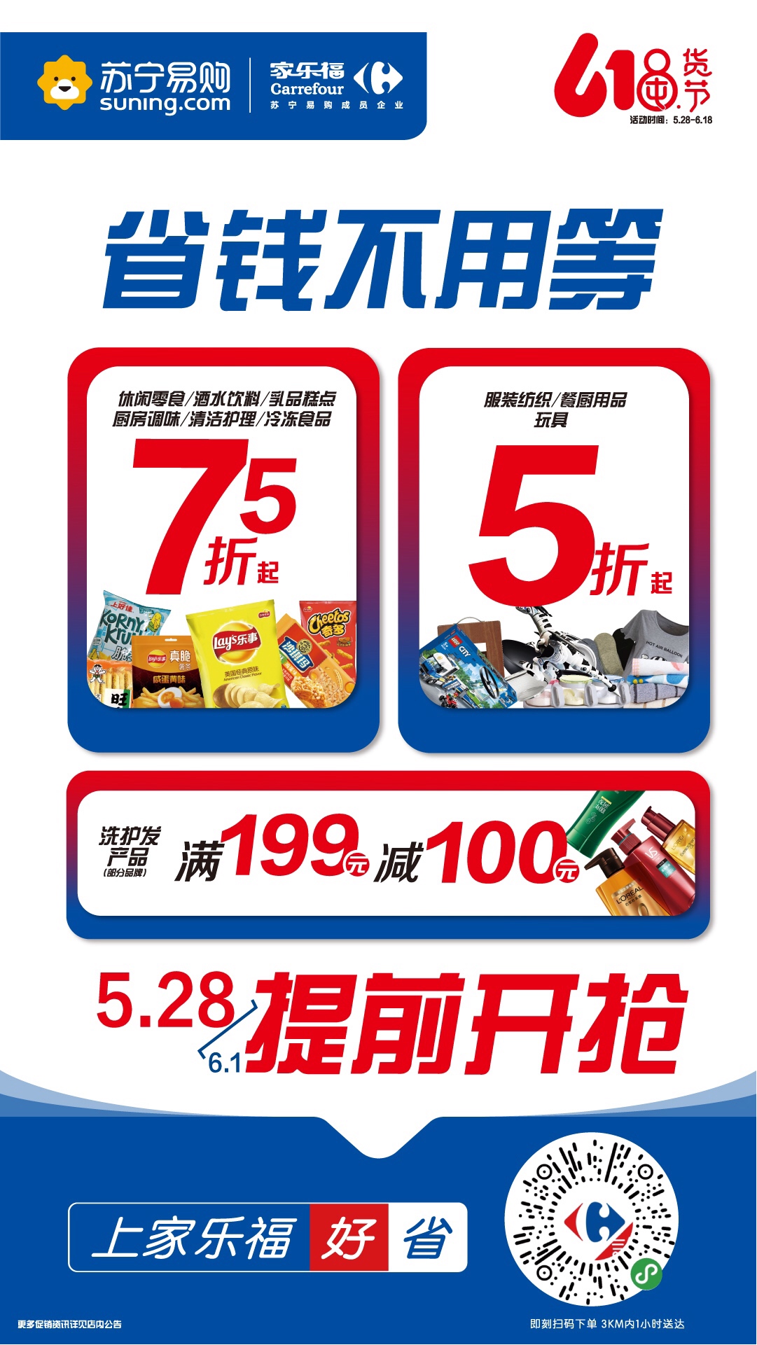作為蘇寧陣營中的排頭兵、蘇寧大快消產(chǎn)業(yè)的核心部分,家樂福率先出戰(zhàn)。為了給消費者提供充足時間選擇心儀的商品,家樂福618囤貨節(jié)即將拉開帷幕,讓消費者盡享“618省錢不用等”的升級購物體驗。