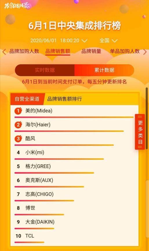 在品類表現(xiàn)上,空調(diào)、冰洗、彩電銷售火熱。爆發(fā)1分鐘,空調(diào)整體銷售破1.9億,明星產(chǎn)品美的智弧系列18小時售出160284套;截至18時,健康除菌冰箱洗衣機銷售額同比增長492%。